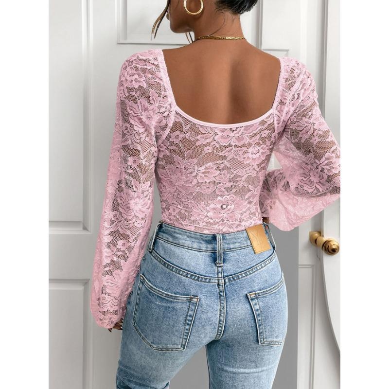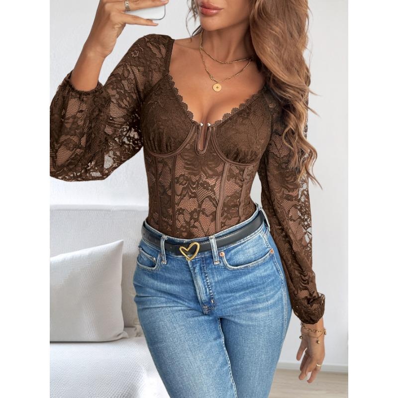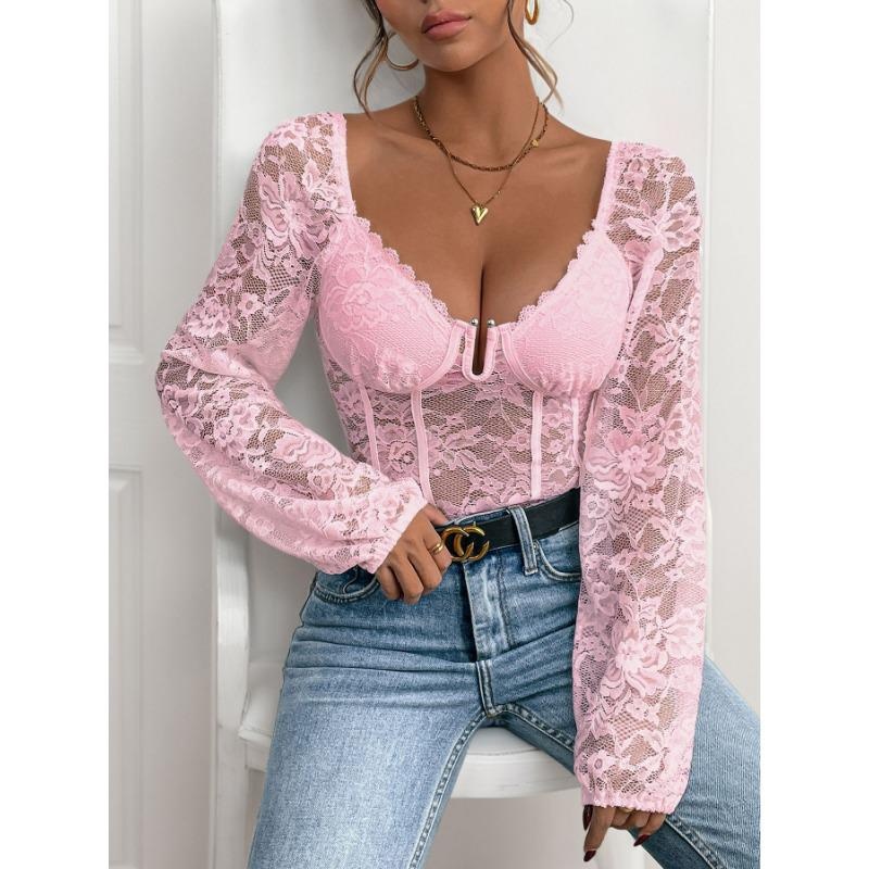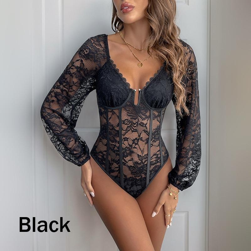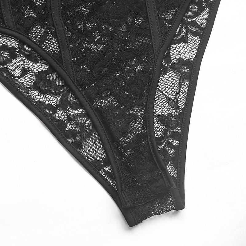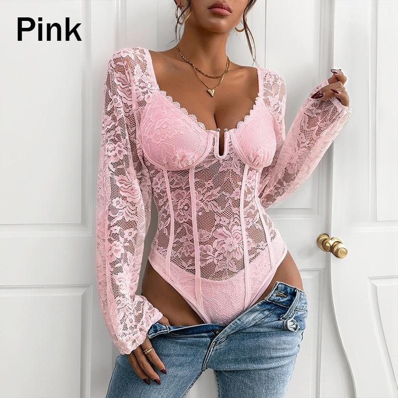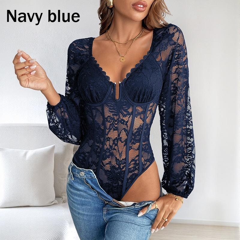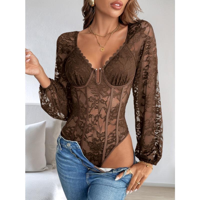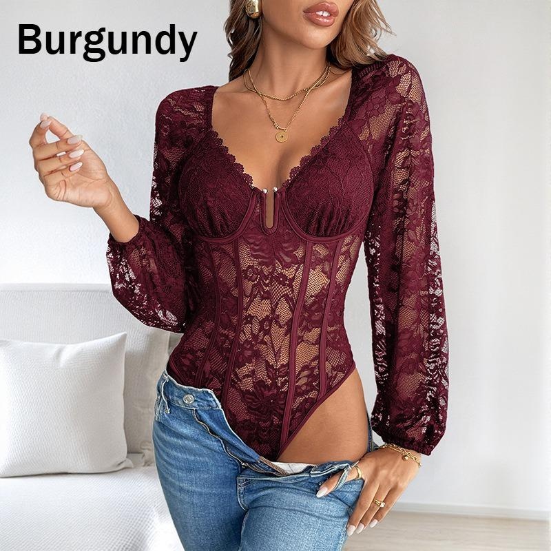 1Pc Sexy V Neck Lace Trim Bodysuit Slimming Solid Color Jumpsuit for Women Fashion Stretchy Figure Hugging Outfit