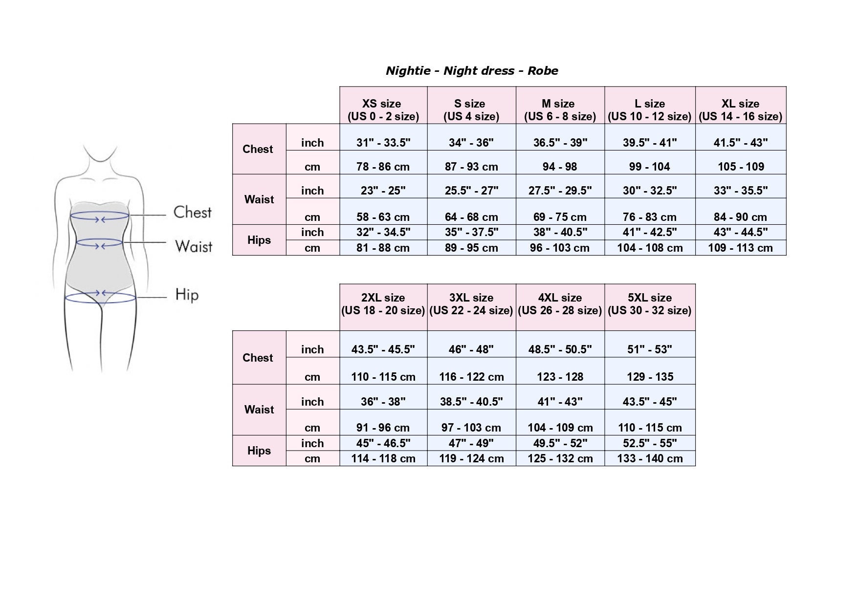 El camisón queda suelto en el cuerpo, la longitud es diferente para cada talla entre 70 y 85 cm/27 y 34 pulgadas