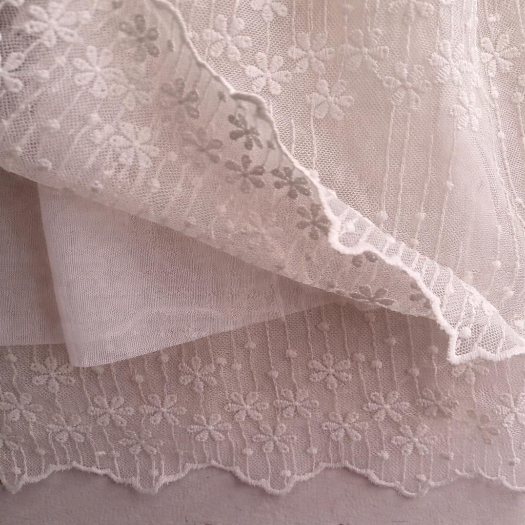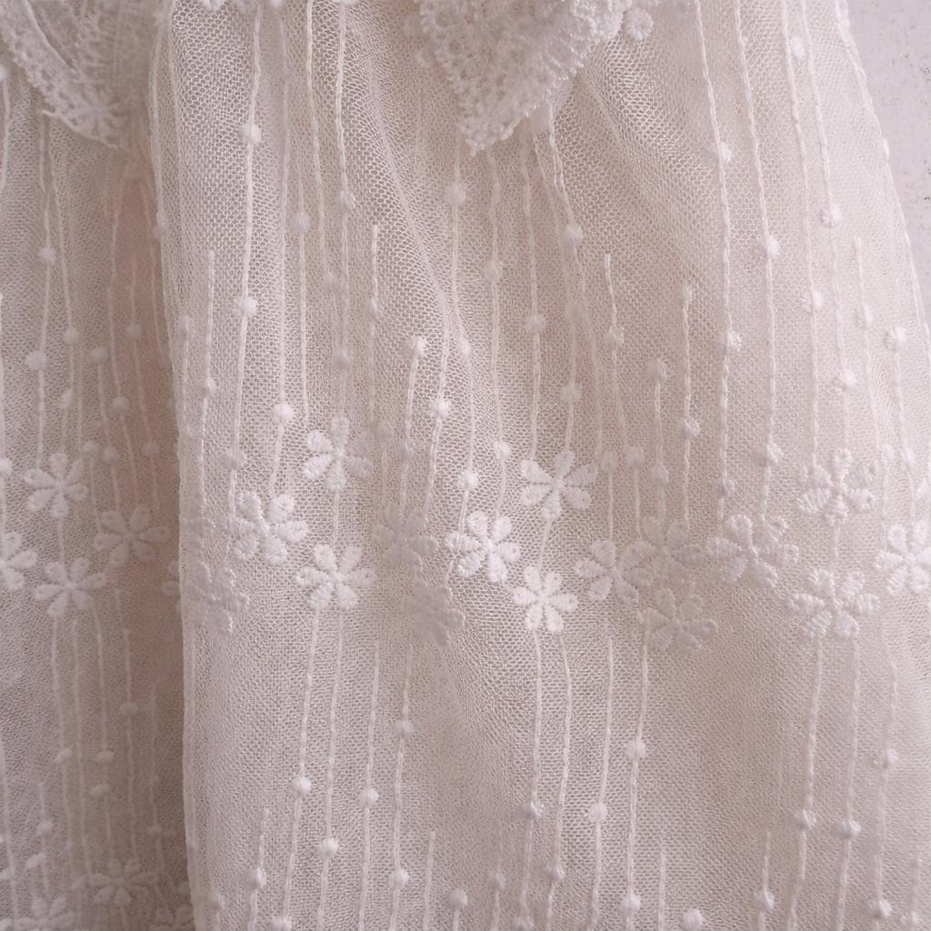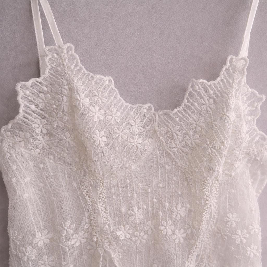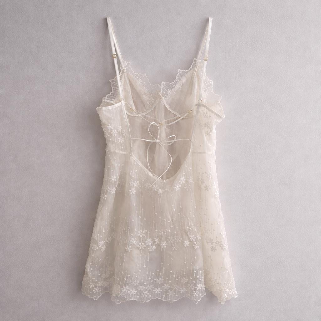 Delicado vestido babydoll de encaje blanco transparente con bordado floral
