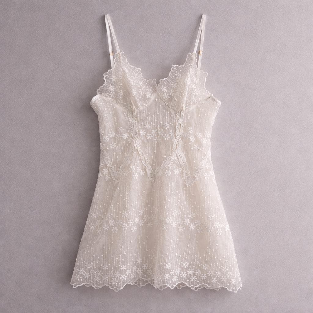 Sé el primero en valorar “Delicado vestido babydoll de encaje blanco transparente con bordado floral”