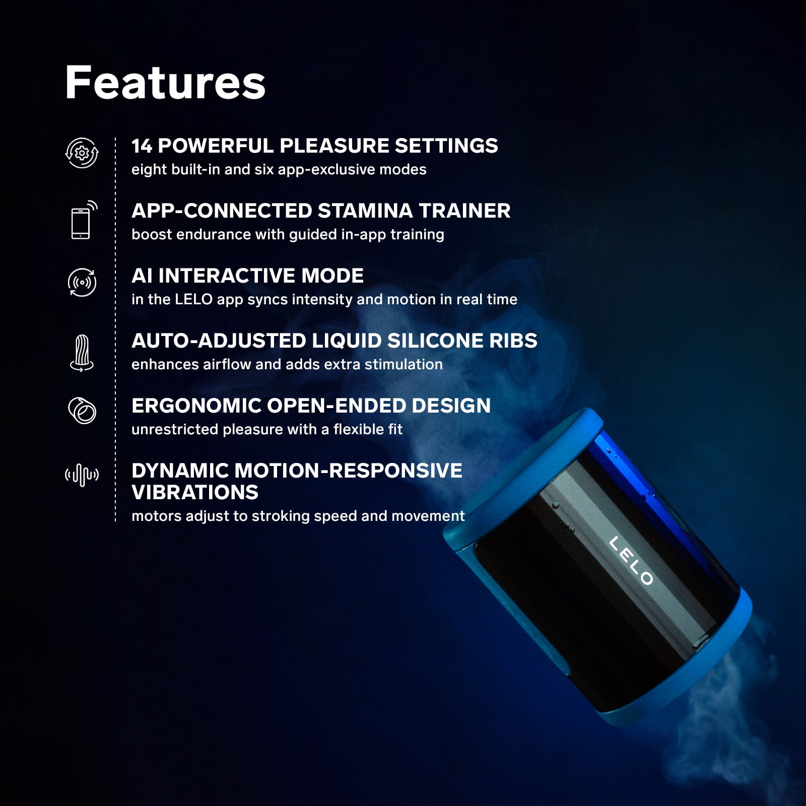 - Modo Interactivo AI – Ubicado en la aplicación LELO, este modo ajusta la intensidad y los patrones de vibración para sincronizar las vibraciones con tus movimientos en el interior